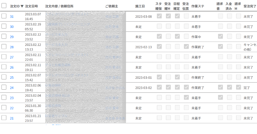 初期ステータスの注文のみを表示させる。→ 新規の注文内容を確認し、スタッフ調整、日程調整を行ったうえで、受注確認メーッセージを送信する。