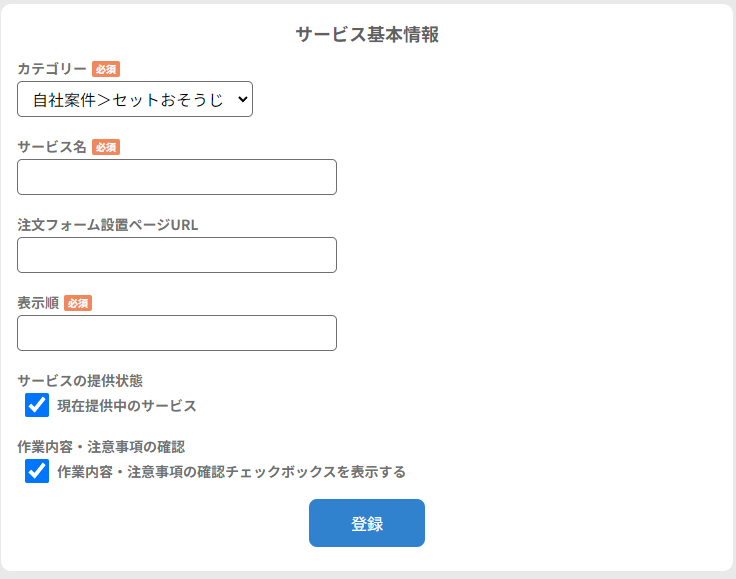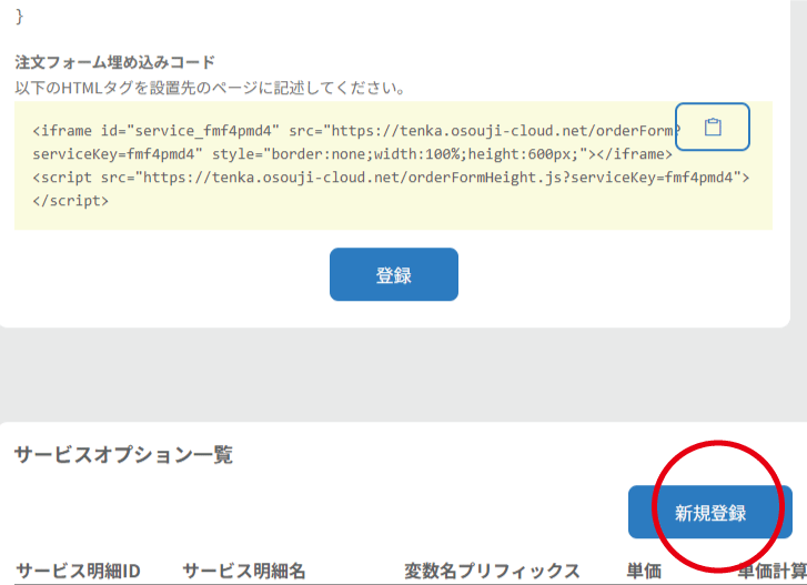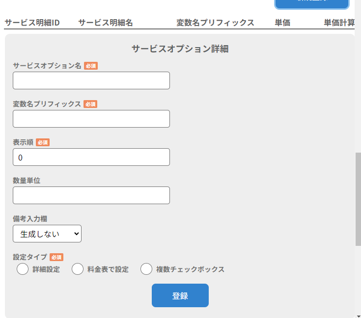 サービスオプション一覧の「新規登録」をクリックして以下の項目を入力する