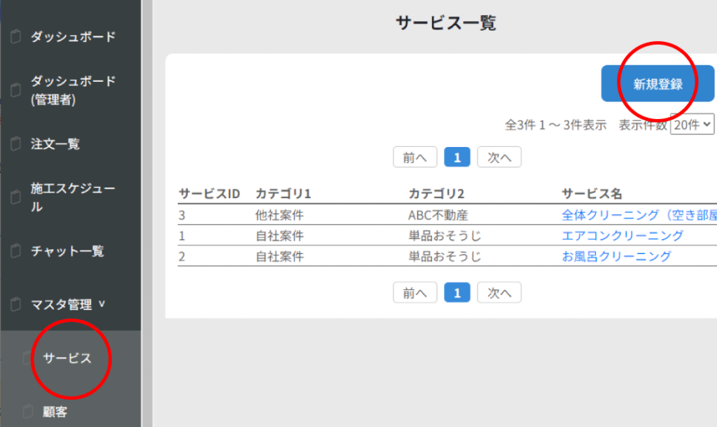 1.「マスタ管理」→「サービス」→「新規登録」をクリックします。
