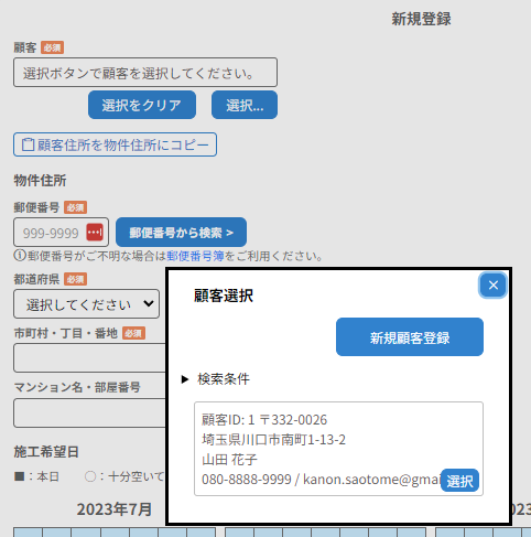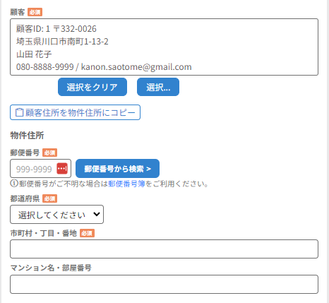物件住所(作業住所)を入力してください。依頼者住所と作業場所住所が同じ場合には、「顧客住所を物件住所にコピー」ボタンをクリックしてください。自動的に入力されます。