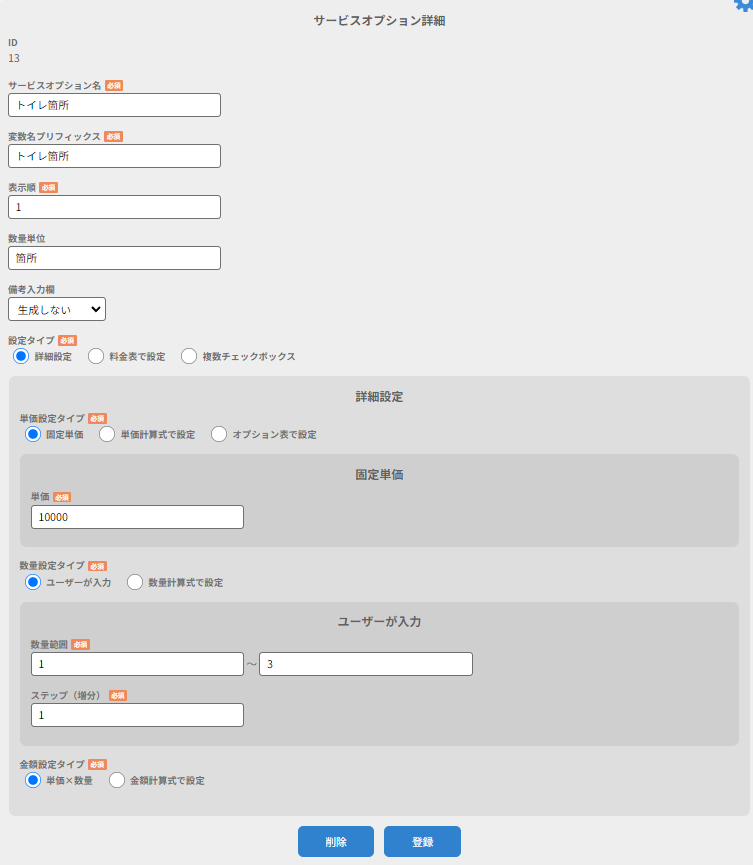 数量設定タイプ ⇒ 「ユーザが入力」を選択し数量範囲と増分を設定する