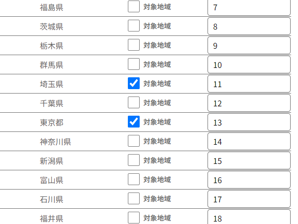 例えば、東京都と埼玉県だけサービスを提供している場合は、東京都と埼玉県にだけ✅を入れます。